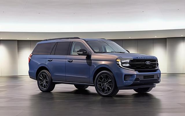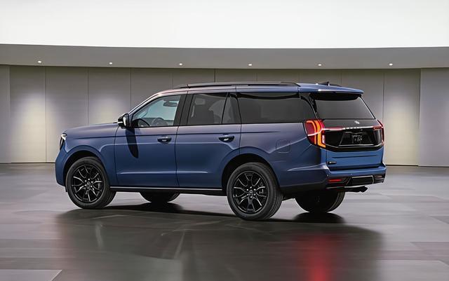 特别版最吸睛的无疑是那套源自Mustang Dark Horse的蓝烬金属三层车漆(Blue Ember metallic)。这种车漆会随光线角度变化呈现出从深邃到明亮的渐变效果,在SUV车型上尤为罕见,为庞大车身增添了几分灵动。配合暗影套件(Stealth Package)的黑色化处理,整车既保留了全尺寸SUV的威严气场,又多了份运动感。